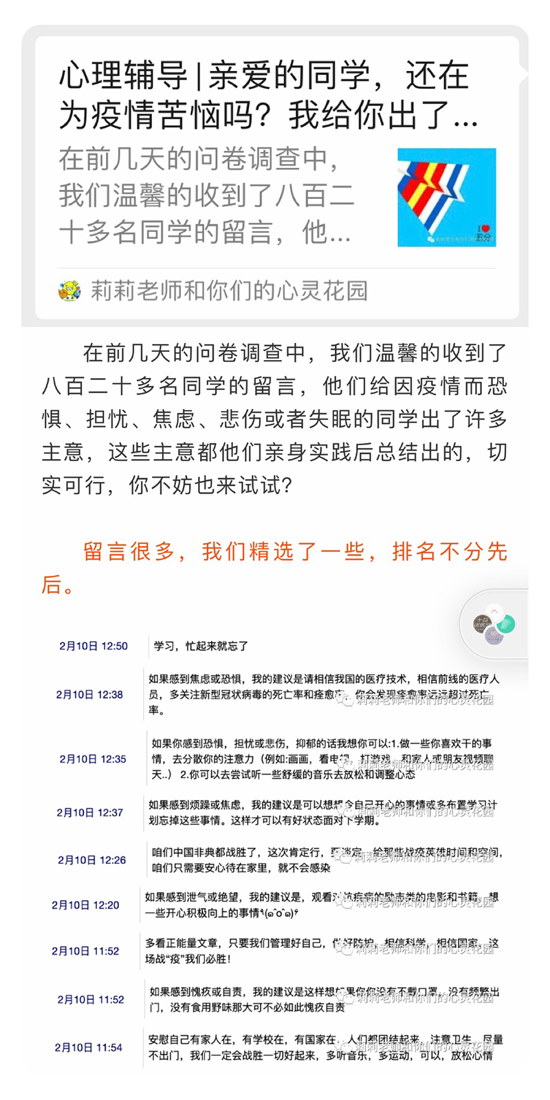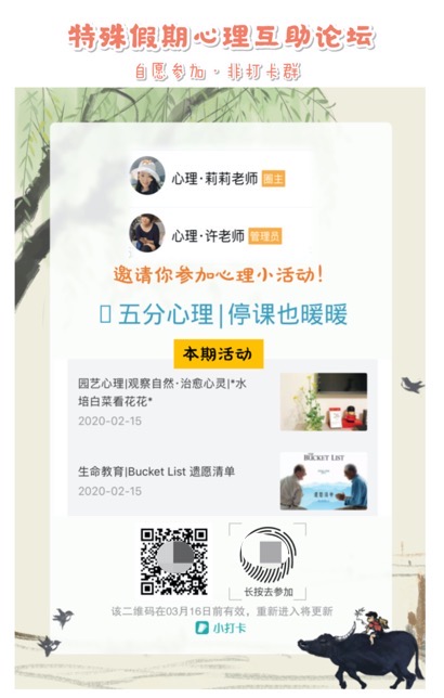 辅导特色①注重学情调查:849份大样本问卷调查使心理辅导的内容和目标更精准;②注重技能落实:通过微信公众号、微信小程序等途径开展的线下活动,确保了线上课教授的心理调适方法在生活中得到迁移;③开展园艺活动与学生一起抚慰身心。通过”水培蔬菜”、”植物彩虹”、”一平米的脚下”、”一株植物献给您”、”寻找夏天”等园艺心理活动,与家长共创积极“愿望清单”等技术,将亲子沟通、情绪调节、压力调控、生命教育、感恩教育等内容融入到生动有趣的活动中。
