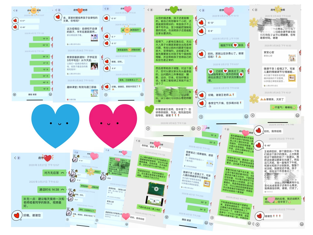 与此同时,心理老师还通过电话、短信等方式,帮助学生、家长、老师们进行心理辅导,随时提供心理支持,为班主任开展班级活动提供建议。面对防疫居家学习生活的不适,化危机为契机,全方位助力学生成长。
