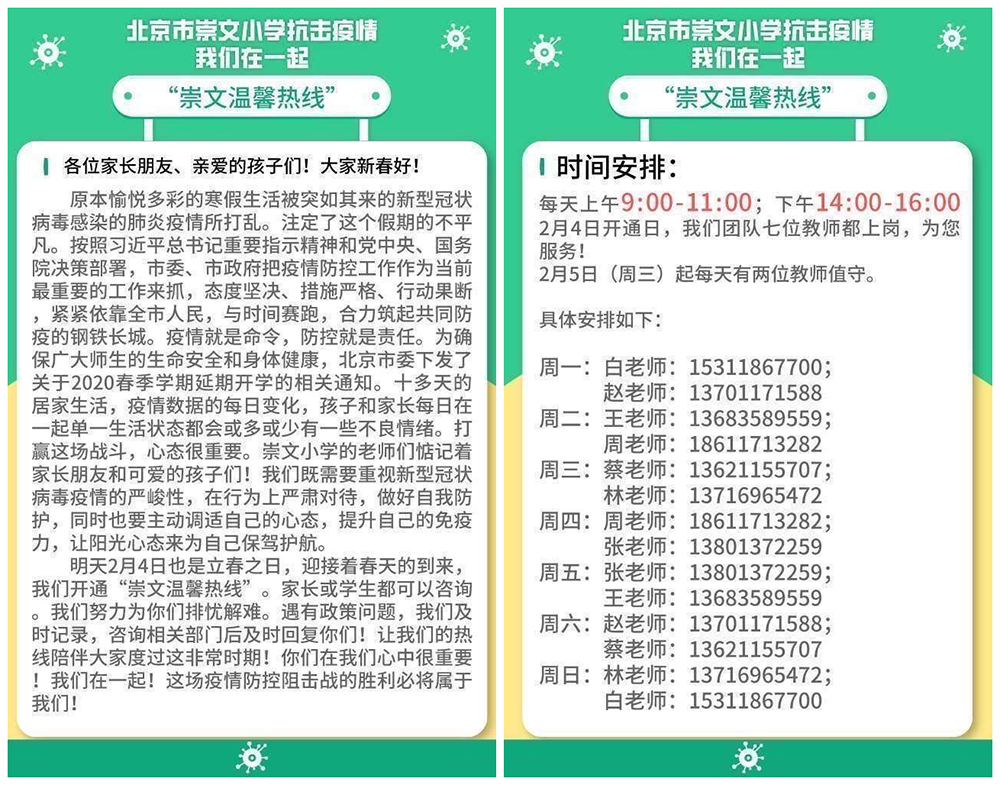 通过对调查问卷的数据分析,能够明显感受到孩子们在教师的关爱、家长的支持下,学会了社会责任与担当,真正出现心理问题的孩子并不多。学校心理教师随时关注着学生需求,坚守“崇文温馨热线”的服务,为家长、学生排忧解难。“崇文温馨热线”帮助了家长、学生更好地关注调整自己的心理状态,健康生活,度过了这个不平凡的假期!