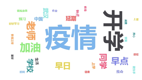 疫情期间,学生拥有了更多和父母亲人居家相处的时间,问卷反应学生对亲子关系的评价普遍较好。在调查的最后,有一个开放性问题——面对疫情后延期开学,你有什么想说的吗?学生表述的关键词出现最多的词是“支持”“加油”,期待“想念同学”、“想念老师”、“想念学校”,想通过开网络视频课解决对下学期学习进度的担心。最令老师感动的是有的孩子写下了“长大我想做医生”的志向。