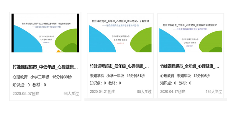 培新小学在疫情阶段学生延学期间关注全体学生心理状态,根据前期家长调查问卷数据发现学生情绪问题,依托学校竹娃课程超市,以团体心理辅导的方式,为不同年级学生录制心理微课,如面向全校学生的心理微课《绘制我的情绪曼陀罗》,帮助学生学习使用绘画的方式缓解自己的焦躁不安;面向低年级学生的心理微课《辨认感觉,了解情绪》《当我生气的时候》帮助低年级学生学会认识情绪,学会表达感受;面向全校学生分中高、中低年级分别录制不同内容的心理微课《遵守规则,让我们做得更好》以抗击疫情为契机,引导学生体验遵守规则的内心感受,树立规则意识; 在525心理健康节来临之际,为全校学生录制心理微课《生命的历程》,同时通过学校公众号录制微讲座《做一个自信的人》,引导学生珍爱生命、关爱自己和他人。