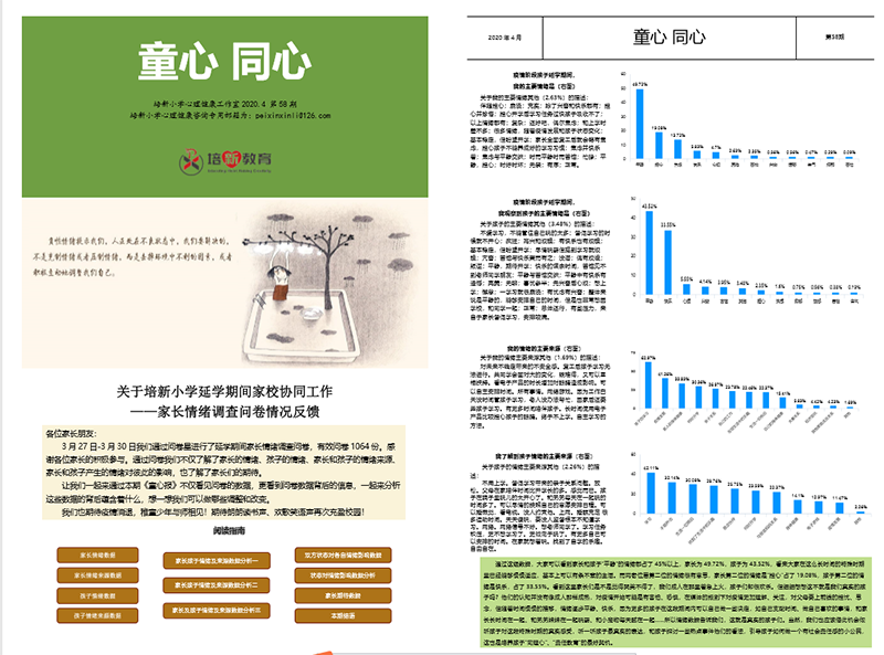 在此期间,同样关注家长心理和教师心理。3月份向全体家长发布“延学期间家校协同工作——家长情绪调查问卷”,在得到一手数据后进行整理,通过《童心同心》报(家长版)和家长们公布数据结果并进行分析,同时给予针对性指导。