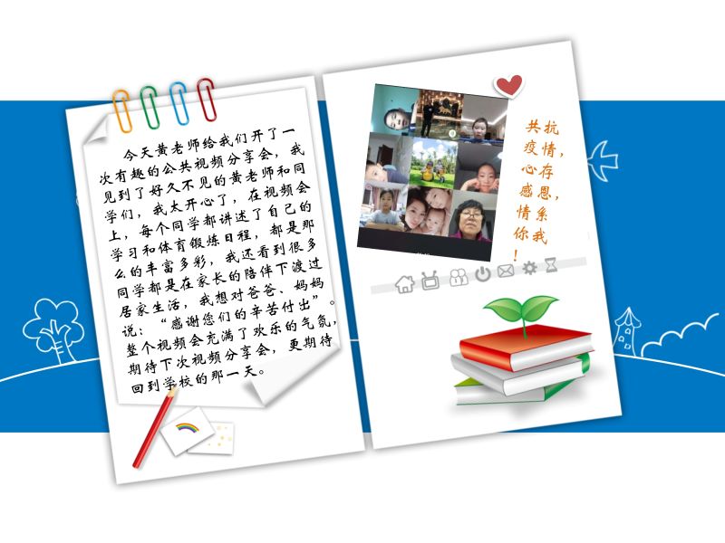 延期开学期间,家校“云”相聚,架起沟通彩虹桥,让学生消除孤独感,树立阳光向上的积极心态;为家长提供专业的指导,建立良好的亲子关系,家校形成共同体,使孩子们的居家学习充实而有收获,隔离不隔爱,让我们携手走过这段不同寻常的日子,留下共同成长的印记。