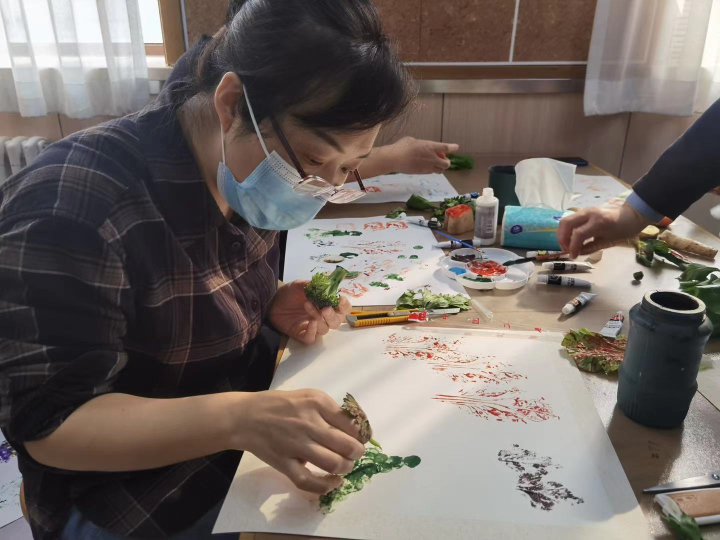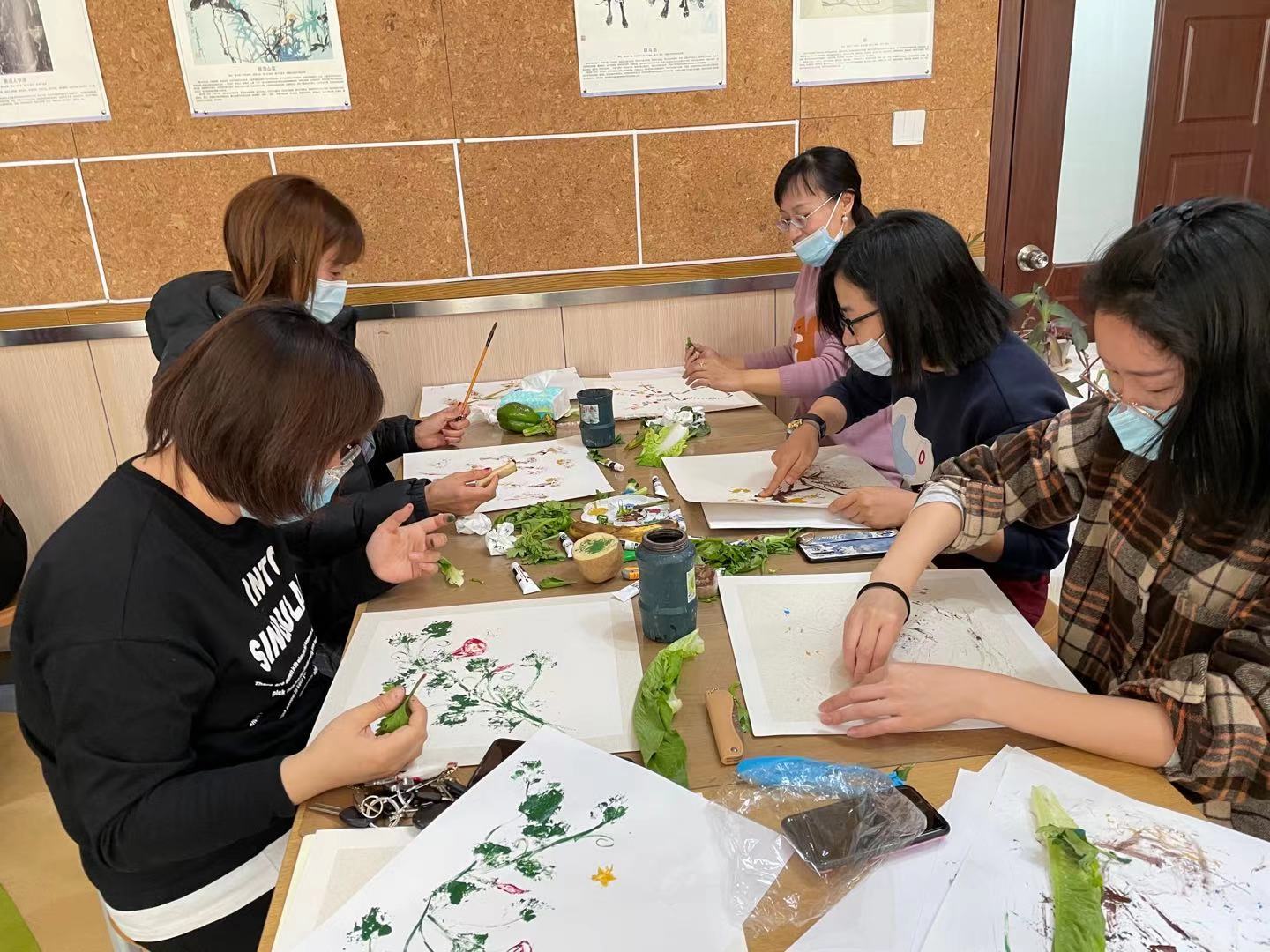选取不同的蔬菜根茎叶,制作不同的切面,粘上颜料就变成不同的图案,老师们边创作、边交流、边感受,在其乐融融的气氛中放松心情,感受自我。