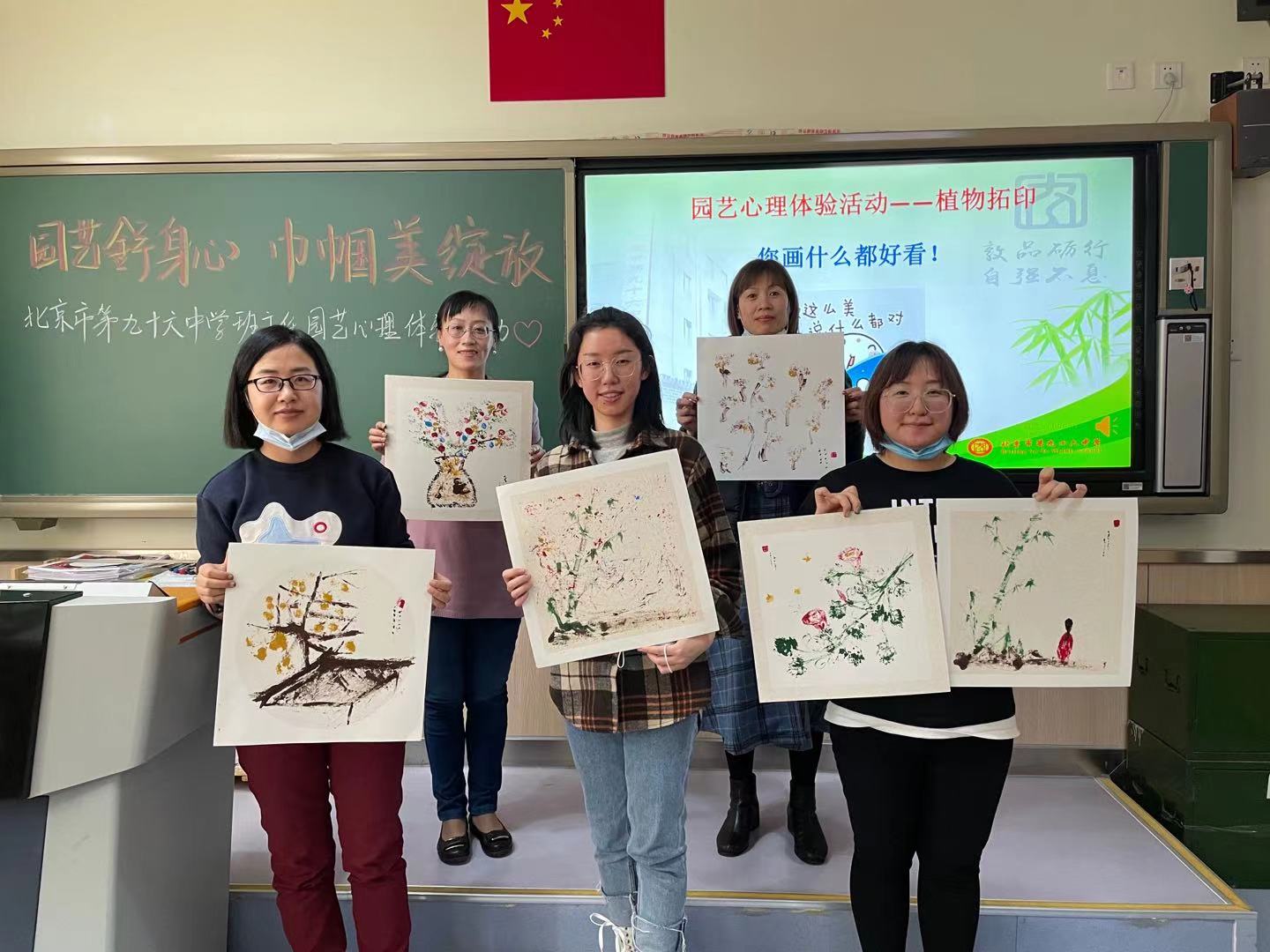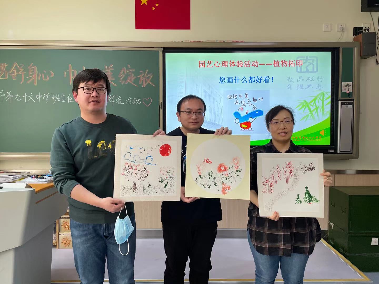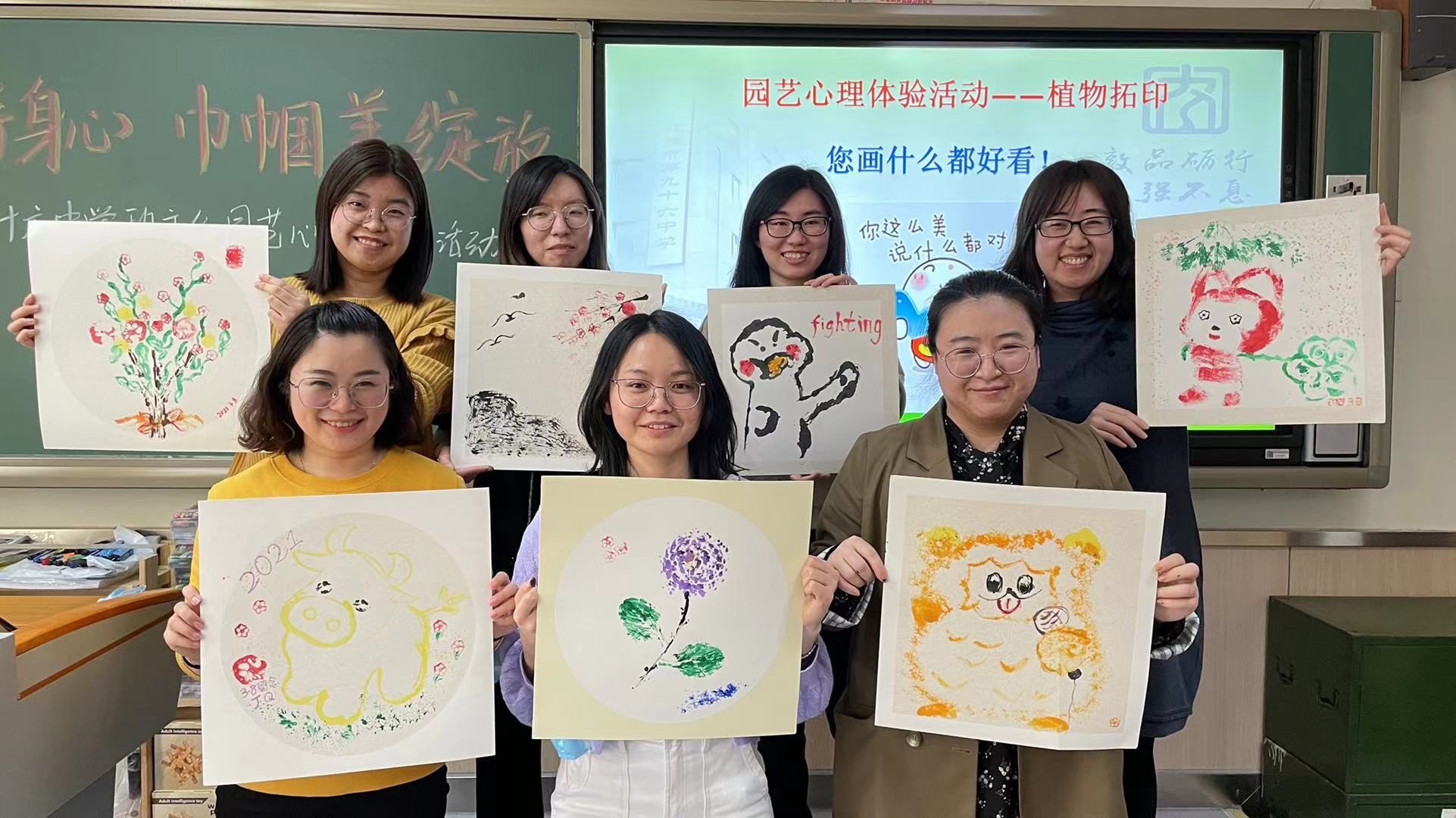 在园艺活动“植物拓印”的过程中,大家交流着班主任情绪有效调节的策略,感受着繁忙工作中难得的和美与宁静,全身心都放松下来。活动提高了老师们心理健康水平及自然联结程度,也增进了老师们之间的沟通。