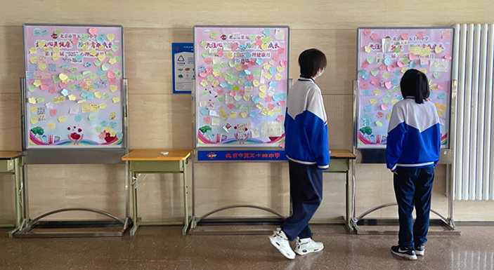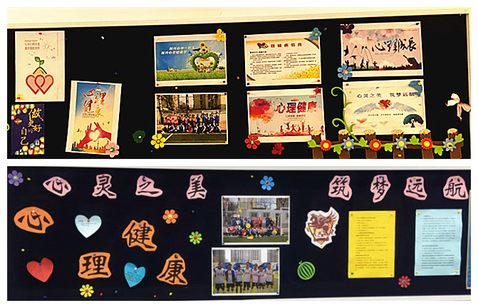 刚刚进入五月,校园内布置展板和宣传海报营造气氛。各个年级和班级都布置了心理健康主题板报。