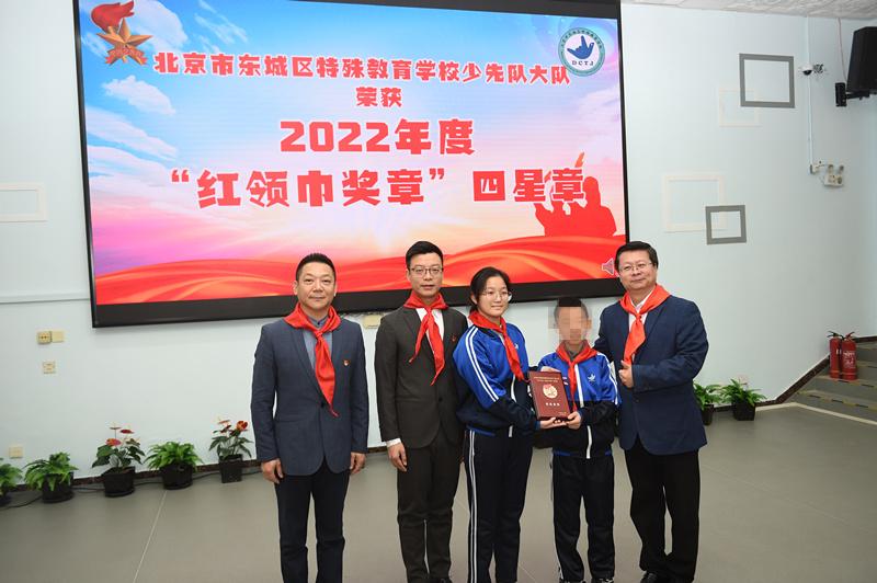 在2022年度,在东城区少先队的关怀下,东城特教党总支、少工委的引领下、在全体少先队员和辅导员老师的共同努力下,北京市东城区特殊教育学校少先队大队荣获北京市四星红领巾奖章。东城区总辅导员潘涤老师和学校尚省三书记共同为学校少先队大队颁发奖牌。