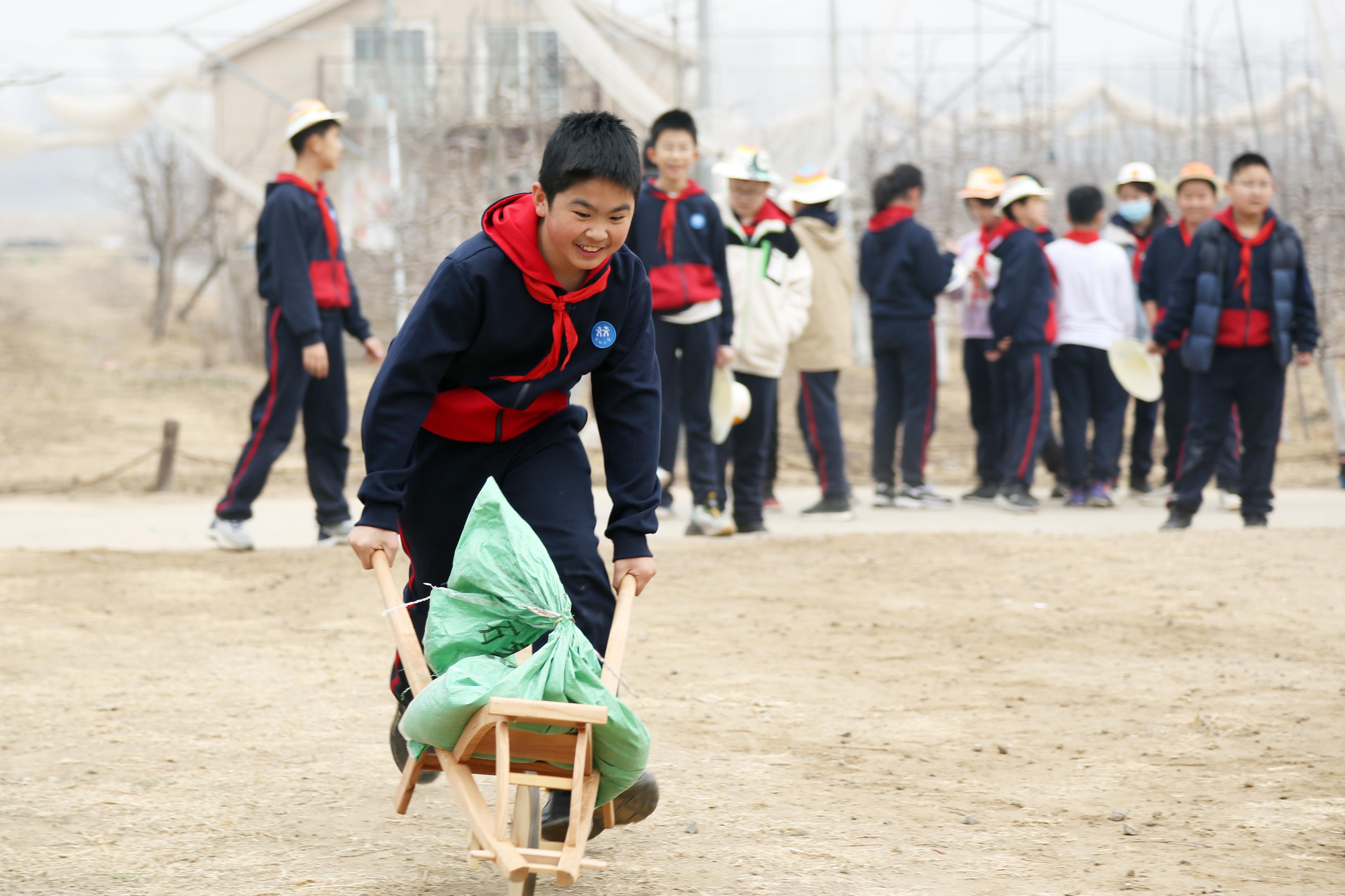 作品介绍:孩子们通过实践活动,身临其境地体验着农民伯伯在田间劳作的辛勤与乐趣。在同学们的加油声中,男孩用力推着车,想象自己满载的金黄的谷物,在阳光的照耀下,笑容纯真幸福。