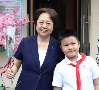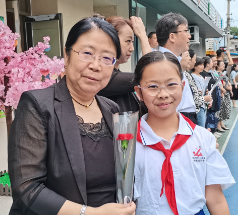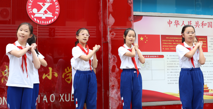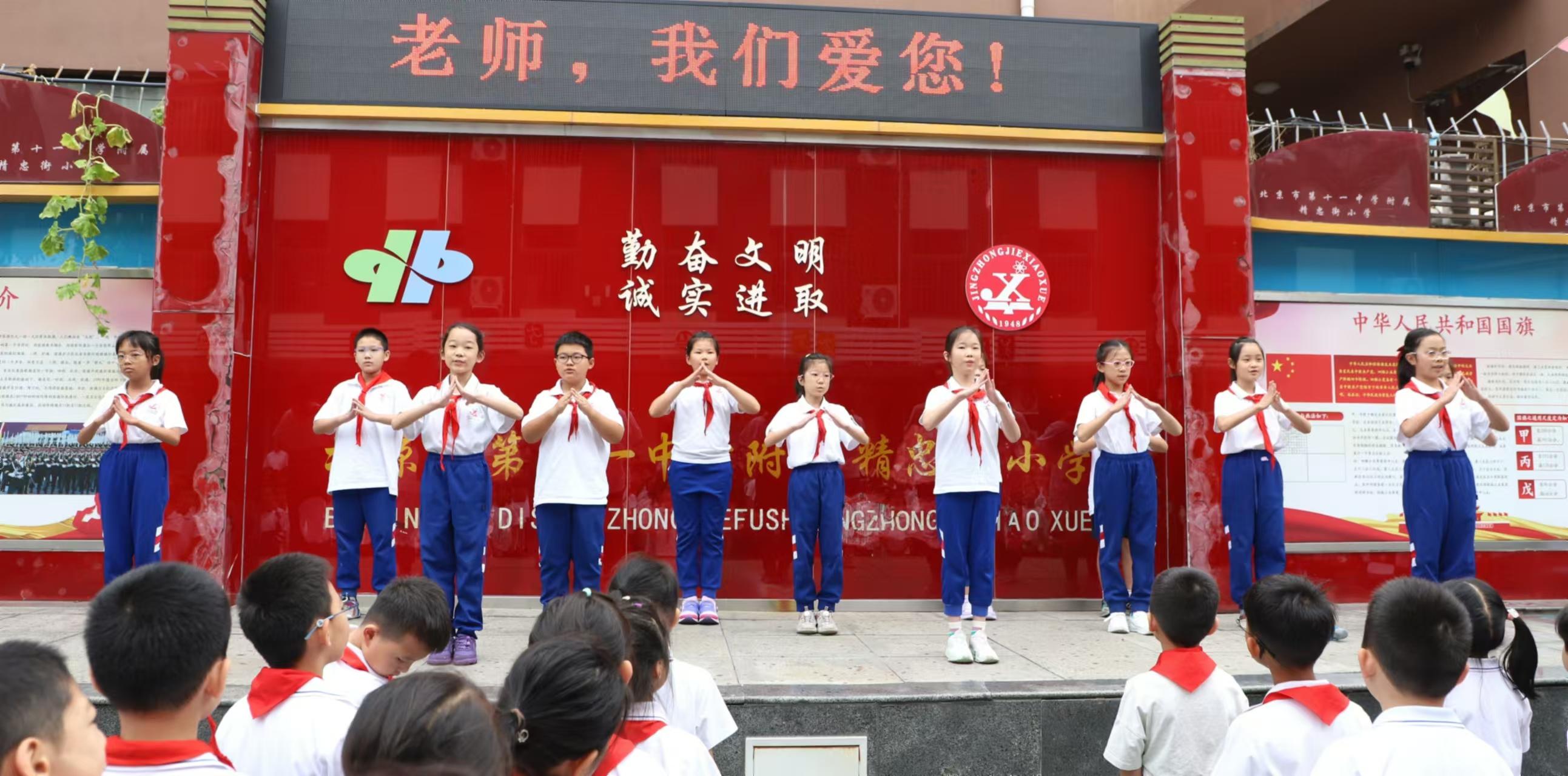 教师们陪伴学生,大手拉着小手,走过了风风雨雨。在精忠街小学的校园中,孩子们收获了知识,更拥有了精彩灿烂的童年时光。四年级学生代表演出节目《有你就幸福》。