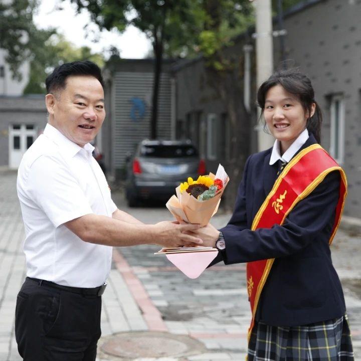 学校领导和学生代表一起,在校门迎接老师,向老师们送上祝福。