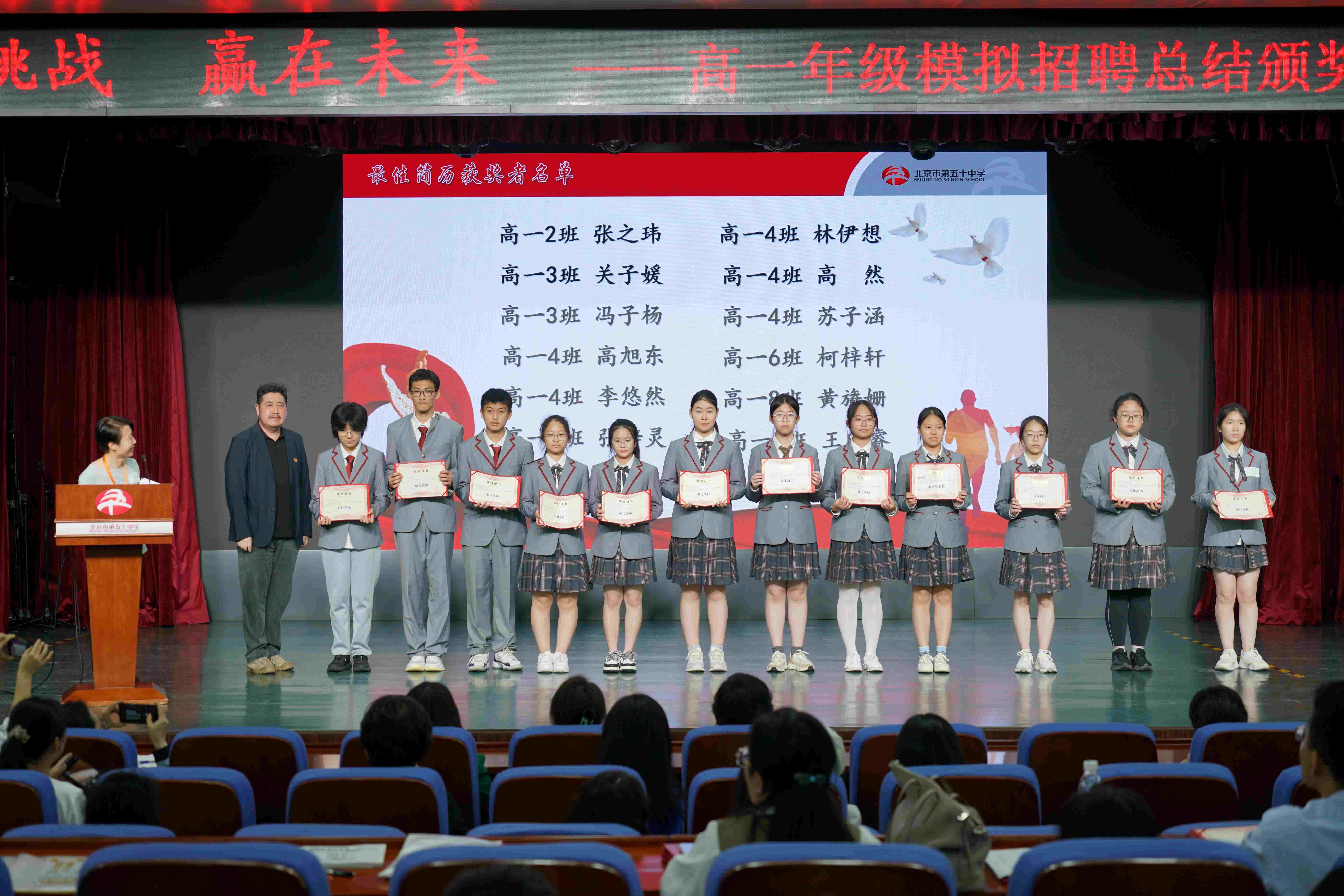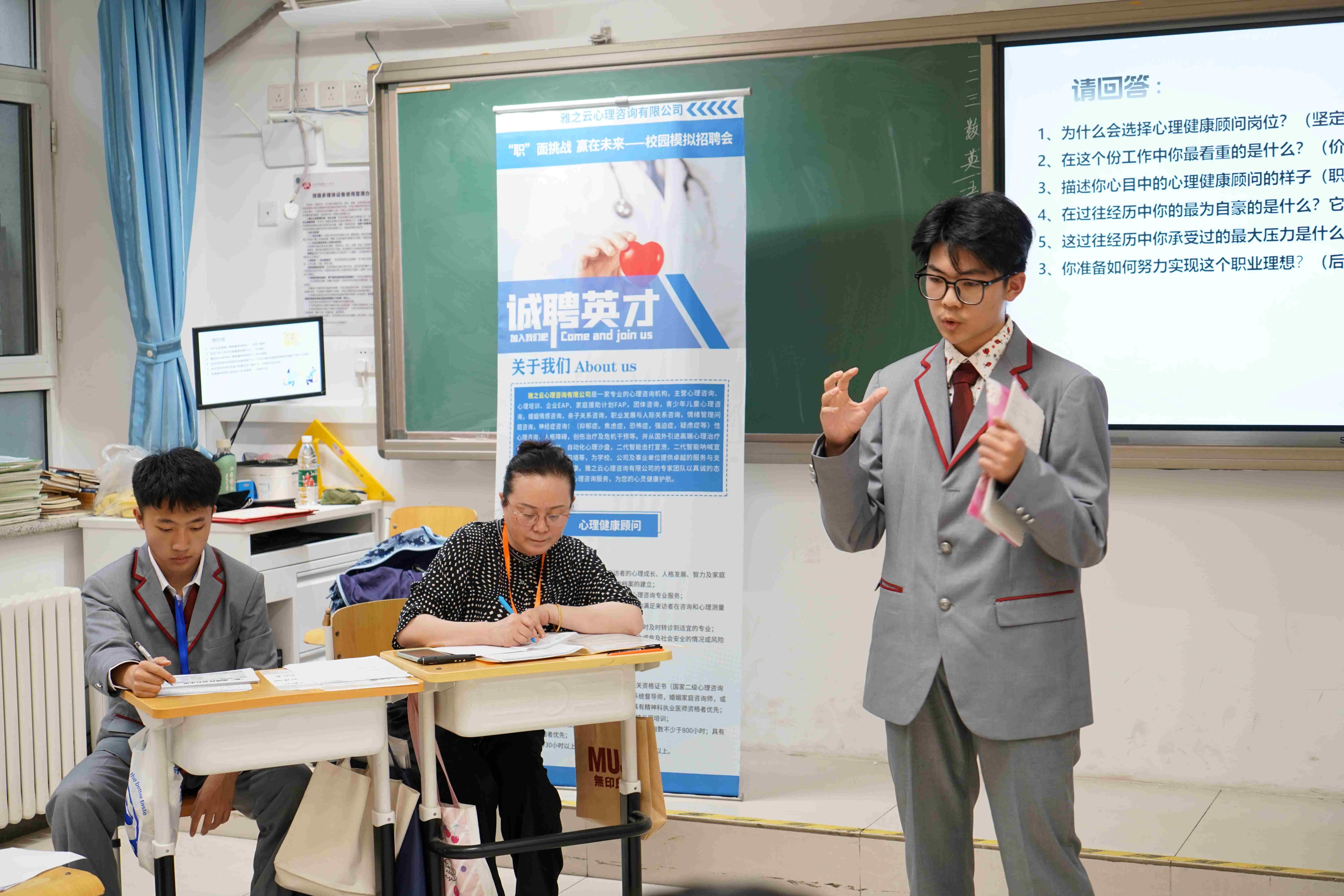 2024年5月10日,北京市第五十中学以“‘职’面挑战 赢在未来”为主题,组织高一年级全体学生开展了一场别开生面的模拟招聘会。作为学校心理健康节的重要实践课程,活动通过真实职场情境模拟,帮助学生明晰职业方向,激发学习内驱力。