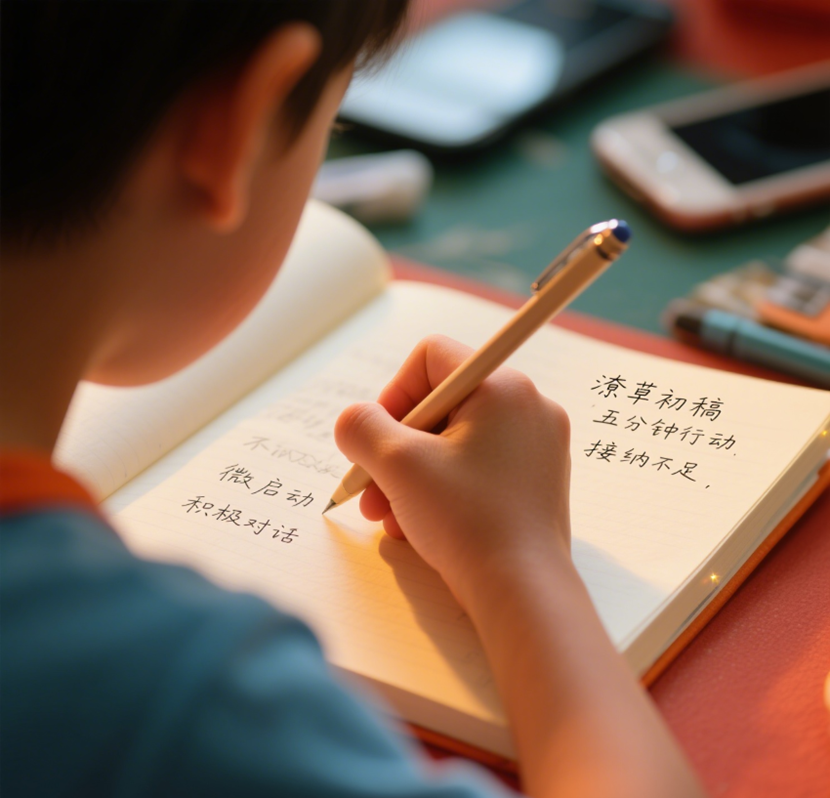 拖延行为背后,往往潜藏着完美主义的隐形陷阱。孩子迟迟无法启动任务,常常源于内心设置了过高的完成标准,总认为“未准备好”或“无法达到理想效果”,最终导致任务被无限期推迟。如同计划背单词却非要等到“安静环境”、“充沛精力”等完美条件齐备,结果拖延至考前最后一夜。“完成永远比完美更接近成功”,帮助孩子理解并接纳“不完美初稿”的价值,能有效缓解其对“高门槛成果”的恐惧。鼓励孩子尝试“微启动”:在草稿纸上抄写五个核心词汇开始诵读,便已是在打破坚冰。每一次微小却真实的开始,都在松动完美主义设下的心理枷锁。