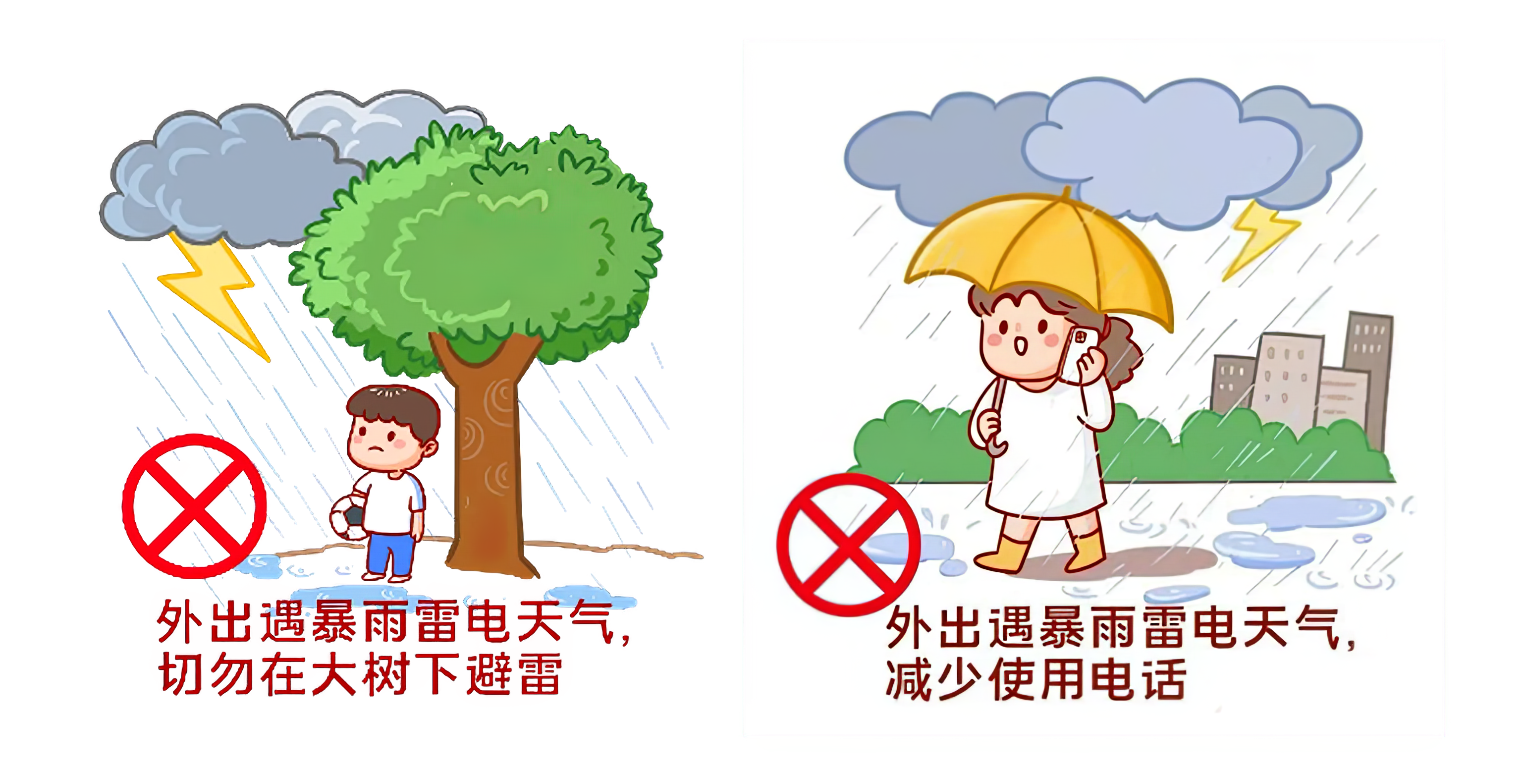 2.谨防雷雨。及时关注天气预报和预警信息,极端天气非必要不外出。雷雨天气避免在露天、树下或水边溜达,避免接触金属管线;积水中行走注意观察,防止跌入坑井或洞中;减少使用手机,远离围墙、广告牌和大树;暴雨前后,避免进入山区、河谷等地质灾害易发区域。